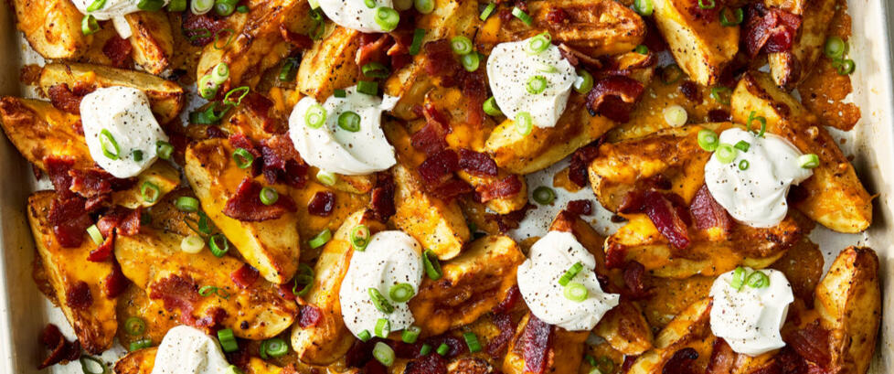 crispy, golden, & thick popoto pieces smothered in sharp cheddar cheese & mild white cheddar with smoky, crispy pieces of bacon.